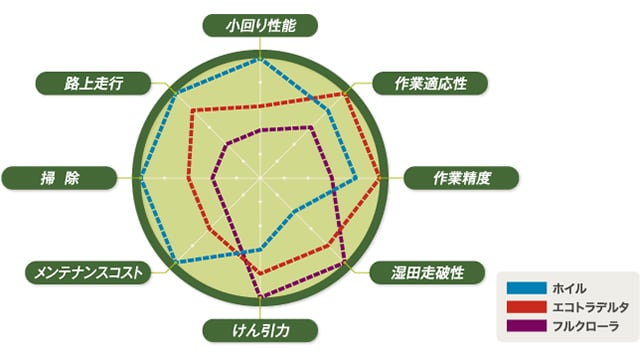 この揺動方式は、けん引力と旋回性のバランスをとることが可能で、しっかりと地面を捕まえることにより、作業安定性、湿田走破性はもとより、耐久性も向上させることができました。この実力はプラウやサブソイラなどの重けん引作業や、湿田作業で体感していただけると思います。さらに、あぜ塗りやうね立て作業においては、安定性・直進性に優れた「デルタクローラ」と、作業中に変速を行ってもショックが少ない「無段変速トランスミッション」の組み合せで、キレイな仕上がりを実現します。また、傾斜地にも強く、横滑りしにくいクローラのラグ形状を新たに採用するなど、随所に安定性と快適さの工夫を盛り込むことでエコトラデルタは完成しました。
