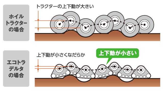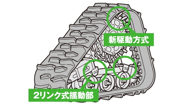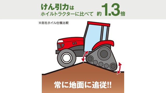 地面にピッタリ追従する揺動式のクローラを搭載。さらに前上がりを抑制することで強いグリップ力を実現し、悪条件でも余裕のけん引力を発揮します。