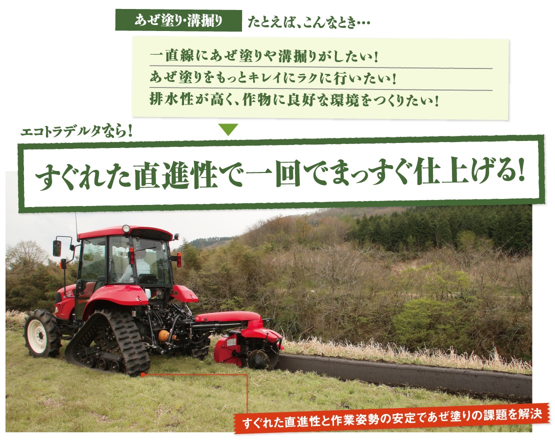 作業機をオフセットするあぜ塗り作業では、横方向の偏荷重がかかるため、左右の安定性が仕上がりを左右します。エコトラデルタなら、ホイルよりも接地面が広いので、あぜからの荷重を受け止めやすく、直進性にも優れているところがいいですね。