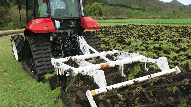 有機物と土壌との粗混和で微生物が活性し、腐植が促進されます。 偶数ナイフは前列・後列がそれぞれ逆の一方向の反転なので、すき込みムラがなく、きれいに起こせます。