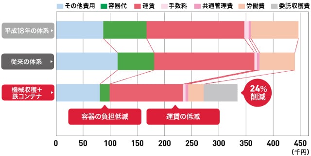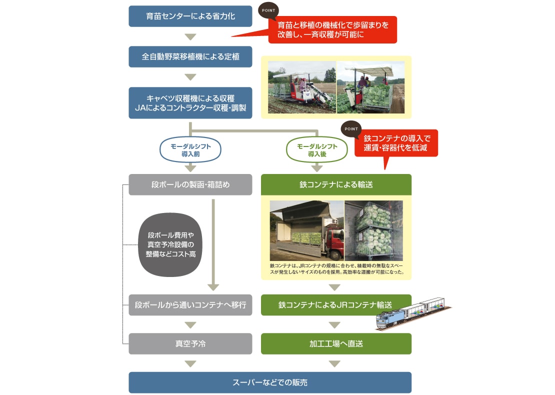 モーダルシフトについて同JAの面白いところは、より効率よく運べるように、鉄コンテナを改良したことだ。これによって、71%だった空間占有率を84%に高めた。またキャベツ三大コストの中の運賃、容器代が下がった。
