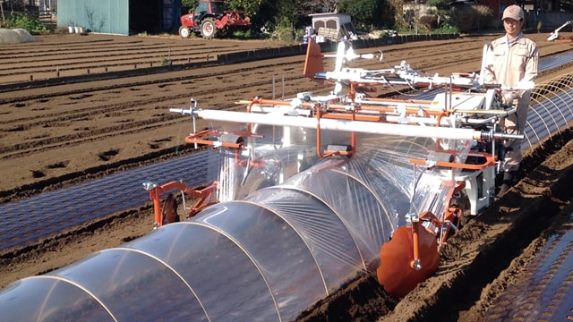 にんじんの生産量では全国で常に上位に入る長崎県。その中でも島原市は肥沃な黒ボク土壌が広がる産地だ。西南暖地といえども冬場につくる春にんじんはトンネル栽培でつくられている。そして人手による支柱の打込み作業はつらい仕事だ。しかも当地では、昔から狭い段々畑で栽培し、農地を目一杯使うことからうね間が狭く、作業性は決して良くない。このような条件の中、(株)藤木農機製作所(本社/大阪府東大阪市)製のトンネルマルチ支柱打込機〈うち丸〉(以下、〈うち丸〉)が注目を浴びている。個人農家ながら、基盤整備を機に同機を導入された機械化の先駆者に、その導入メリットをうかがった。