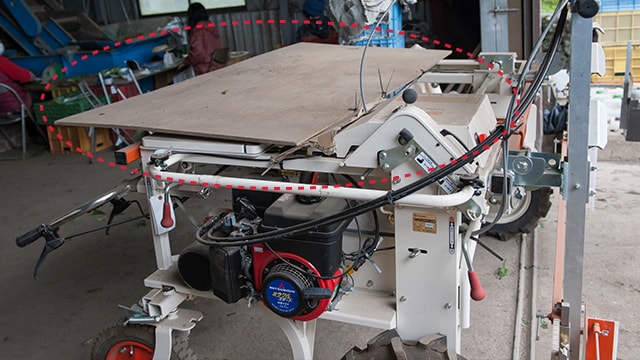 山口氏のこだわり精神は機械にも見ることができる。作業をより楽に、使いやすく、効率良く使うために、機体天面にコンパネを取り付けておられる。本機の上に1往復分の支柱の束を乗せて走行するための工夫だ。
