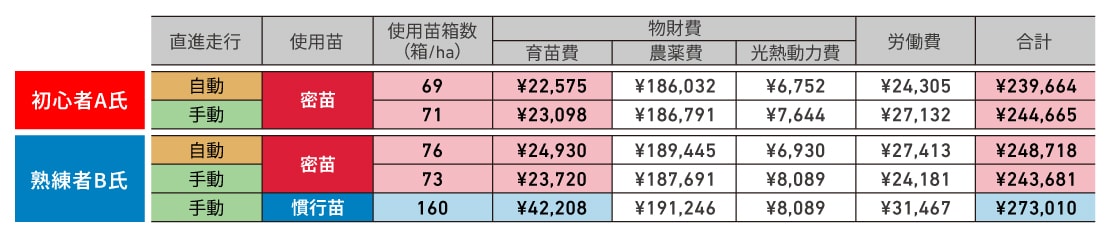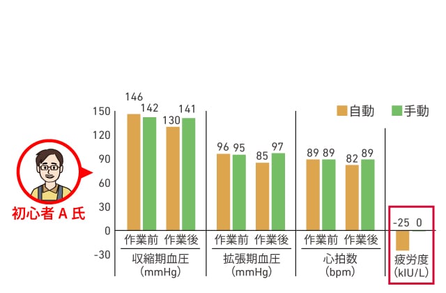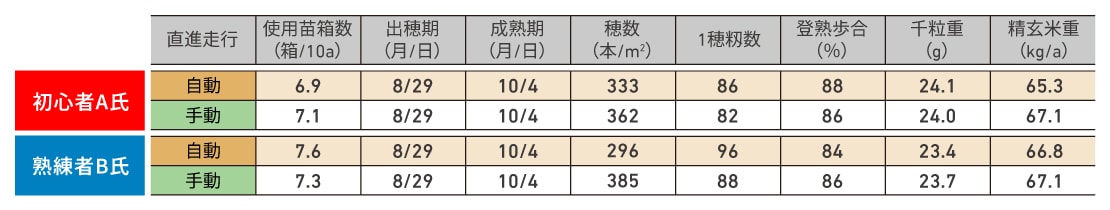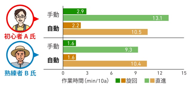 自動走行であれば、初心者A氏が熟練者B氏と同等の能率で作業ができるという結果になりました。