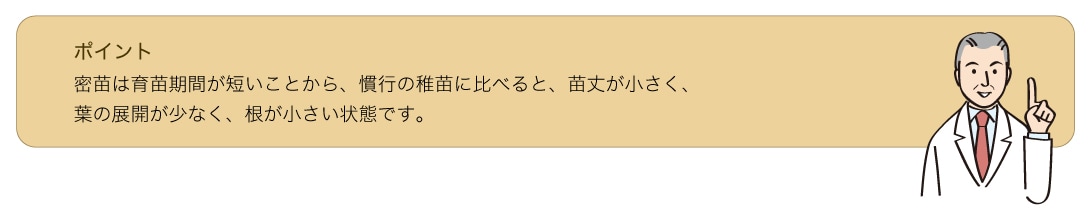 密苗は厚播きのため茎が太くなりにくく、上に伸びやすくなります。慣行苗よりも徒長しやすいため注意しましょう。