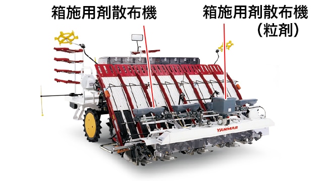 - 田植えと同時に箱施用剤を側条に散布するので、薬効が期待できます。また、散布ムラ・こぼれも防げます。