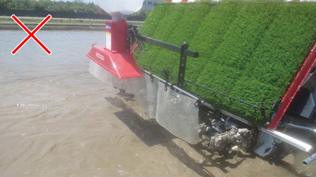 深水での田植えは、浮き苗になりやすく、枕地など深いところは低速で植えるようにしましょう。