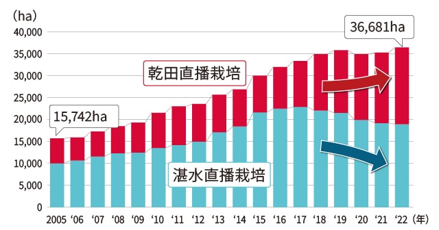 水稲直播栽培は、ほ場の湛水の有無により、湛水直播栽培と乾田直播栽培の2種類があります。水稲直播栽培の面積は、全国で約3.7万ha(2022年)におよび、前年比104%の増加傾向にあり、特に北海道や東北で乾田直播面積が増加。湛水・乾田直播栽培の両方と移植の各技術向上が水稲作全体の生産力向上に貢献するといえます。