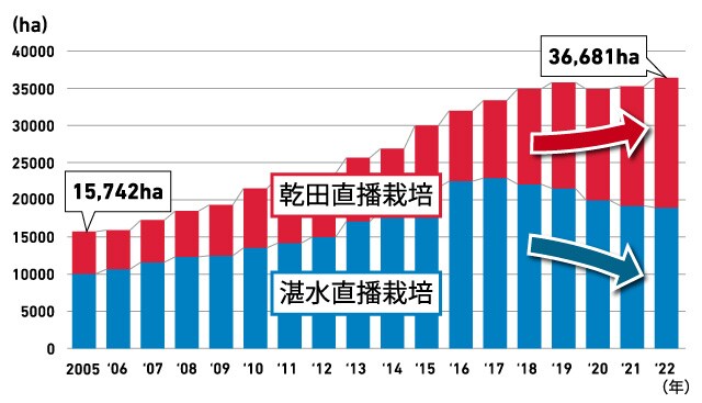 水稲直播栽培は、全国で約3.7万ha(2022年産)の取り組みとなっており、前年比104%で推移しています。特に北海道や東北で乾田直播面積が増加しています。湛水・乾田直播の両方と移植の各技術向上が水稲作全体の生産力向上に貢献するといえます。