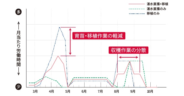 密苗は、同じ面積でも慣行栽培より少ない苗箱数ですみ、培土などの資材費が低減できる他、播種や苗運搬にかかる時間や人件費、労力も軽減できます。さらに、育苗作業や田植え時の苗運びなどが不要な水稲直播栽培と密苗を組み合わせれば、春作業の負担を抑えるとともに、収穫期の作業ピークが分散できるため、担い手1人当たりの労働時間を削減しながら経営規模の拡大が可能になります。