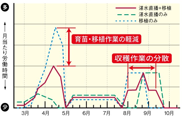 水稲直播栽培では、育苗・移植作業不要であるため春作業の省力化が図られるため、通常の移植栽培に比べて労働時間が削減します。また、収穫期が1~2週間程度遅れることから、移植栽培と組み合わせることにより作業ピークを分散し、担い手1人当たりの経営面積の拡大に有効です。