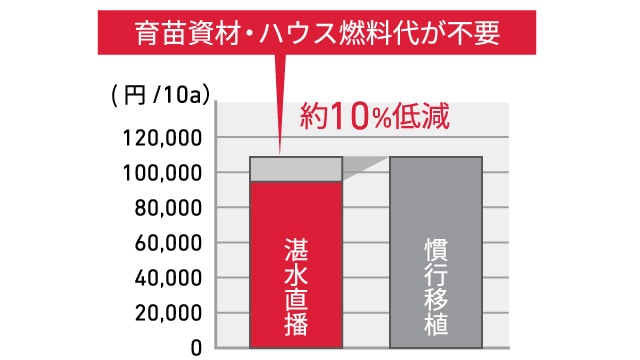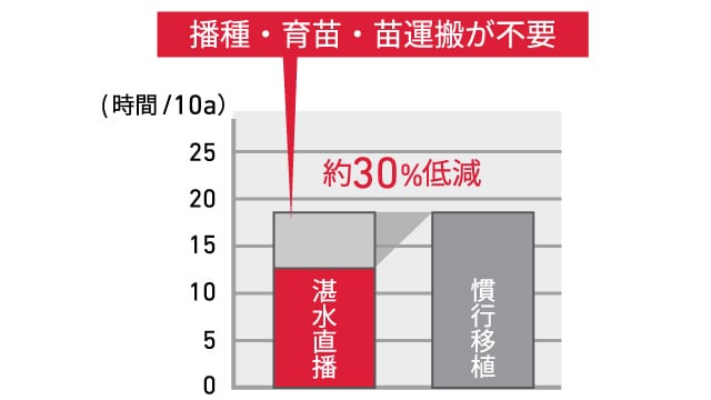 出芽促進を目的とした種もみへの処理(被覆や催芽)が必要です。育苗の必要がなく経費や労働時間の低減、重い苗箱運搬が不要となり、作業の省力化が図れます。また、春作業の労働ピークを分散させ、機械や施設の稼働率を向上できます。