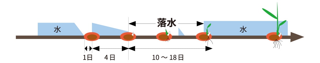 湛水直播栽培は、代かき後の湛水土壌に直接種もみを播種する方法です。