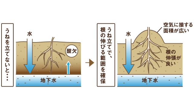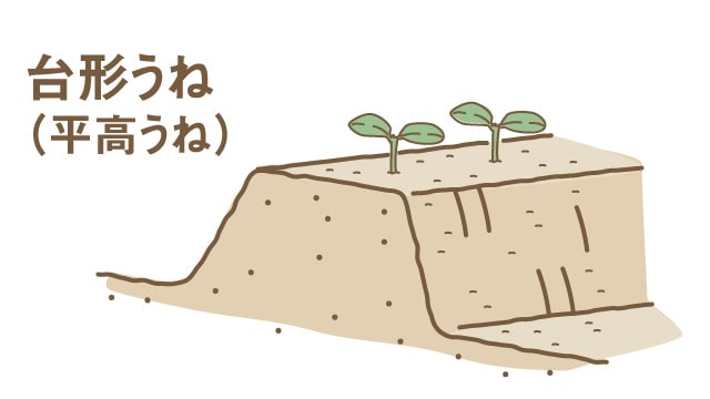 うねの形状は、栽培する作物や土質に合わせて決めます。うねの高さは、水はけの良い土地では低く、水はけの悪い土地では高くというのが基本です。
