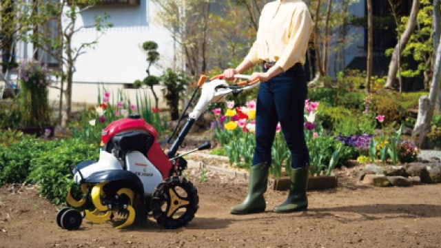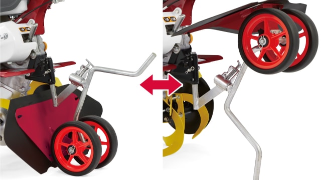 アタッチメントの移動輪で、畑間の移動がラクに行えます。