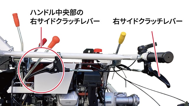 ハンドル中央部に右サイドクラッチレバーを追加。作業時にうね間を歩くときも、右のサイドクラッチレバーが操作しやすくなりました。また、ツノ型ハンドルの採用により、軽い力で機体の前方が持ち上がるので、旋回もラクにできます。