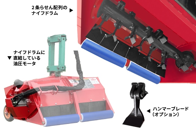 - 刈り能力・耐摩耗性共に向上したハンマーナイフを採用。また、オプションでハンマーブレードをお選びいただけます。