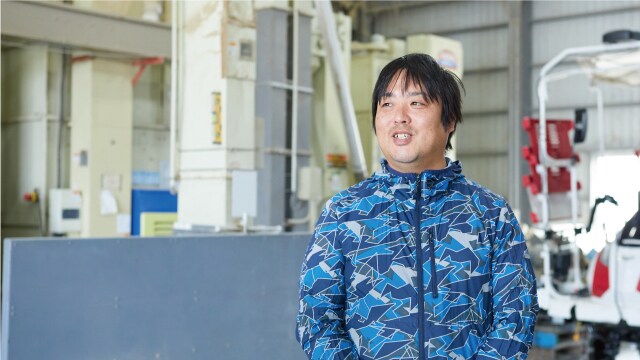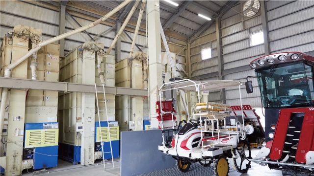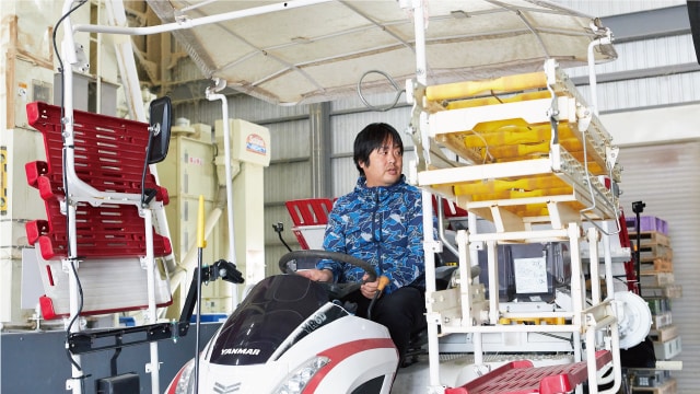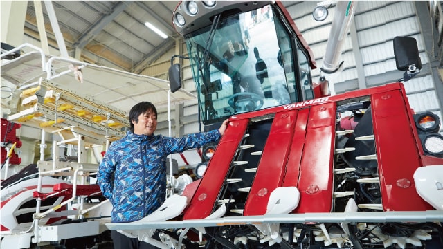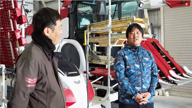 大きな倉庫には巨大な乾燥機と、真新しいヤンマーのトラクター、田植機が並ぶ、地域をけん引する若手農家の樋口さん。樋口さんを含むご家族4名と従業員4名の8名で水稲栽培と水稲の作業請負をされている。