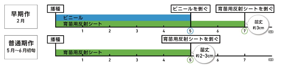 特に密苗の育苗管理のポイントについてお聞きしたところ「宮崎52号など早期作の場合、播種後、苗箱に育苗用反射シートを被せ、さらにその上にハウスのビニールを被せます。そしておよそ5日でビニールを外し、1週間後、芽が3㎝程度で苗がうっすら緑色になってから育苗用反射シートを外します。ハウスのサイドは閉めたままです」「ヒノヒカリなど普通期作の場合、育苗時期が6月にかかり気温が上がるので、育苗用反射シートだけを被せます。およそ5日間で芽が2~3㎝になったら育苗用反射シートを外します。芽がまだ伸びていない場合は、病気が出ないように殺菌剤を散布して、再度育苗用反射シートを被せます。1~2日待って、芽の長さを調整しています」と、作期や品種で管理方法を分けられているとのこと。「品種によっても芽の伸び方が異なります。例えばおてんとそだちは伸びやすいので育苗用反射シートを早く外しますし、ヒノヒカリは逆に伸びにくいので育苗用反射シートを長めにかけておきます。育苗ハウス内の苗の置き場所も品種によって決めています。伸びやすい品種はハウスの温度の低い手前に、伸びにくい品種は温かい奥に置くなど工夫しています」と、ポイントは発芽時のきめ細やかな温度管理であると教えてくださった。