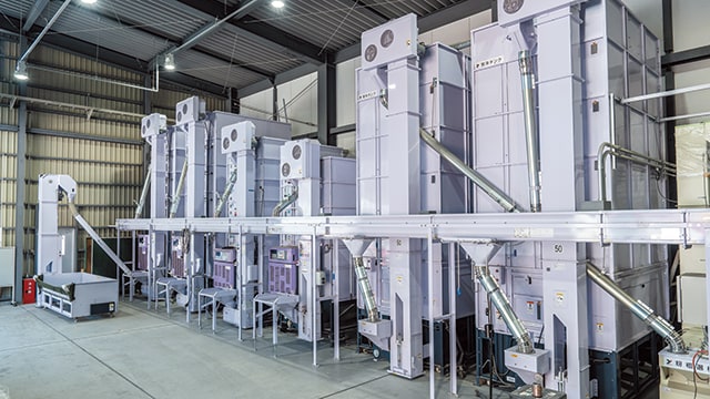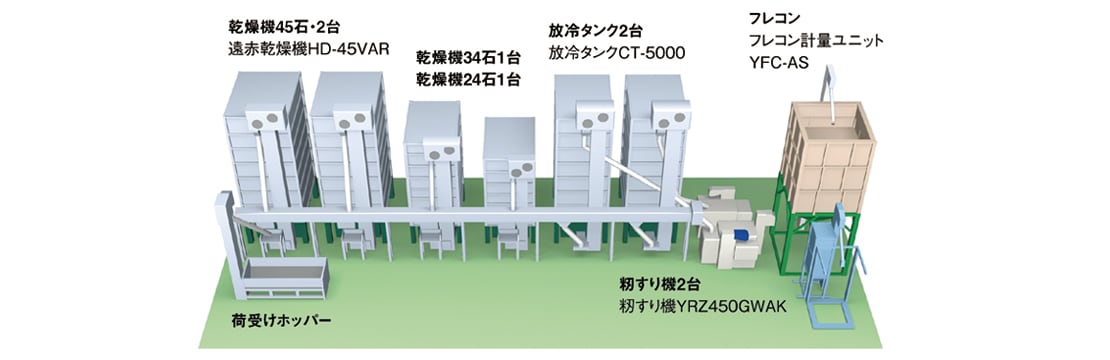 自社の栽培面積と作業受託面積の増加に伴い課題となったのが、乾燥・調製作業の効率化だ。就農当初の4年間は、お父様の代に導入していた小型の乾燥機を倉庫に4台設置して作業していたが、栽培から収穫、乾燥・調製までを1人でこなしていたこともあり、繁忙期は夜の11時ごろまで作業が続いた。「倉庫も小さかったし、袋詰めを終えた玄米を置くスペースも狭くて作業効率が悪かったんです。このままでは新たな農地を引き受けられなくなると思い、ライスセンターの建設をヤンマーさんに依頼しました」。