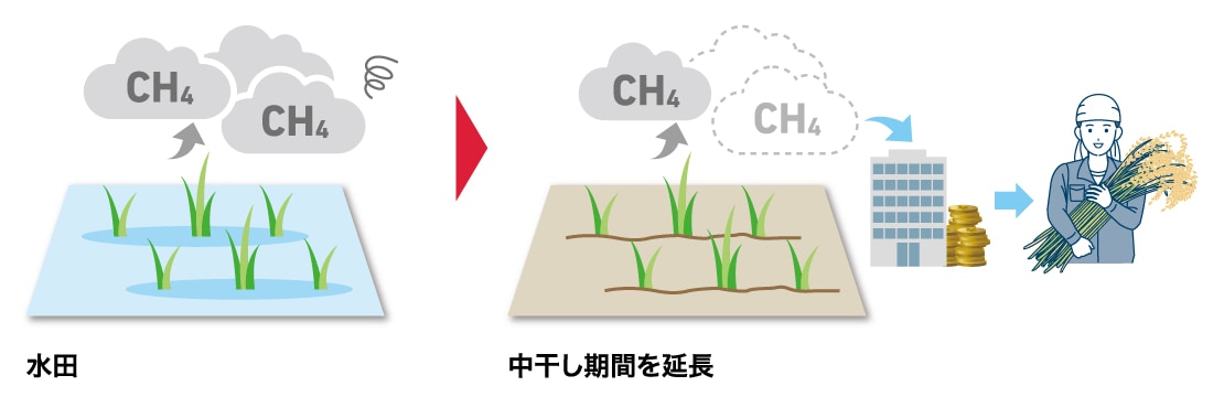 中干し期間の延長により温室効果ガスであるメタンの排出量を減らし、その温暖化対策の成果を企業に売ることで、水稲生産者の皆さまは環境負荷低減による新たな収入を得ることができます。