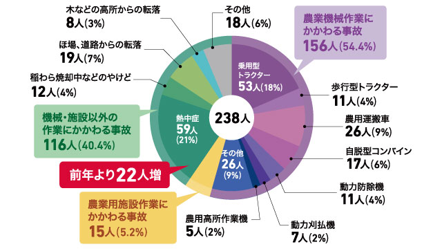 また軽傷を含むすべての事故では、交差点などのない道路を走行中に、追突される事故が多く発生しています。特に作業機付きトラクターで道路を走行される場合は、灯火など、必要な対応をしてから走行してください。