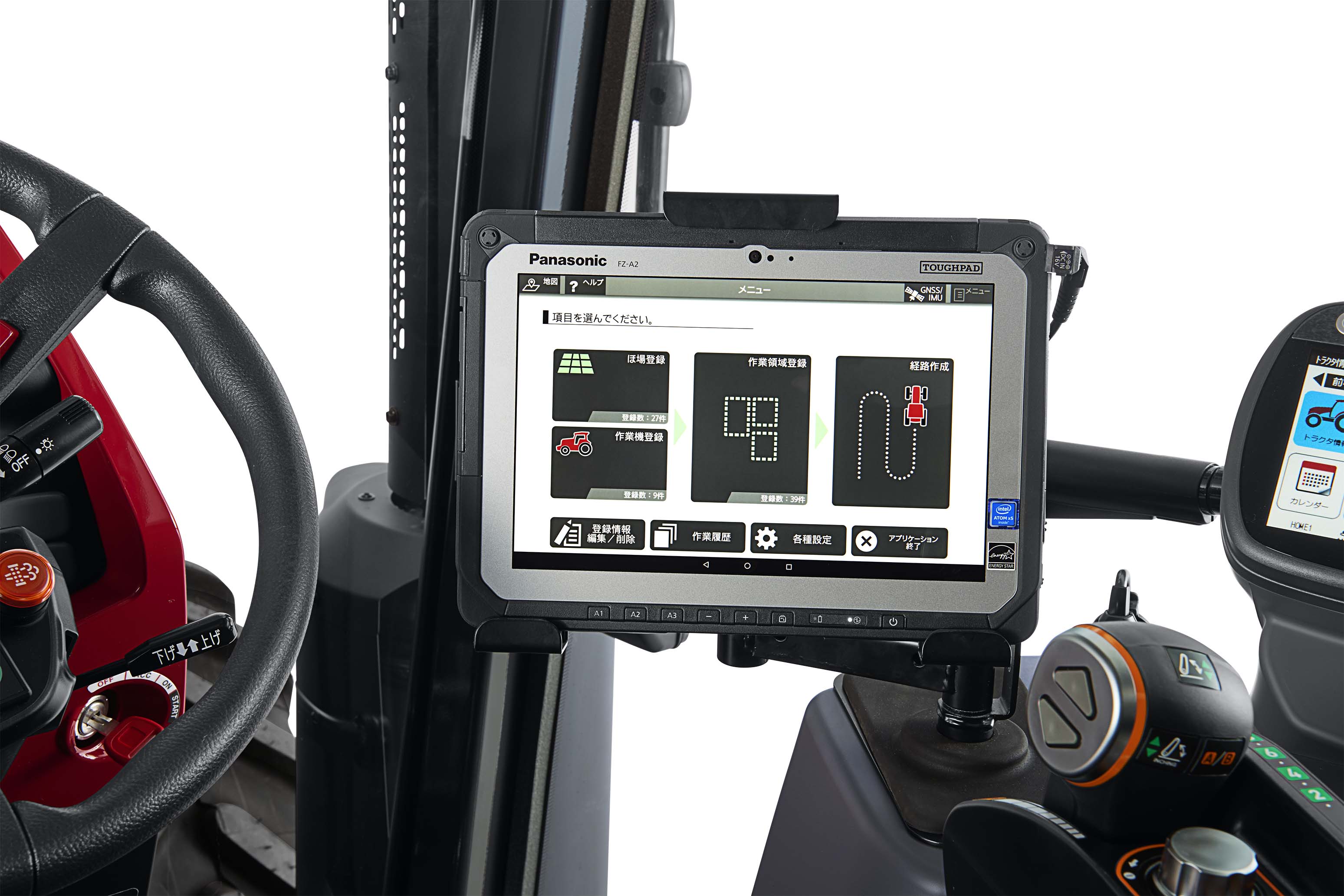 操作・設定には防塵・防水性に優れた10.1インチのタブレットを採用。タブレット内の情報はアイコンやイラストで表示し、作業領域や経路作成、運転中の軌跡確認など、簡単な操作が可能です。また、2台のトラクターでの協調作業時には、随伴(あるいは併走)する有人トラクター内にて近距離監視を行いながらタブレットにより無人トラクターを操作します。