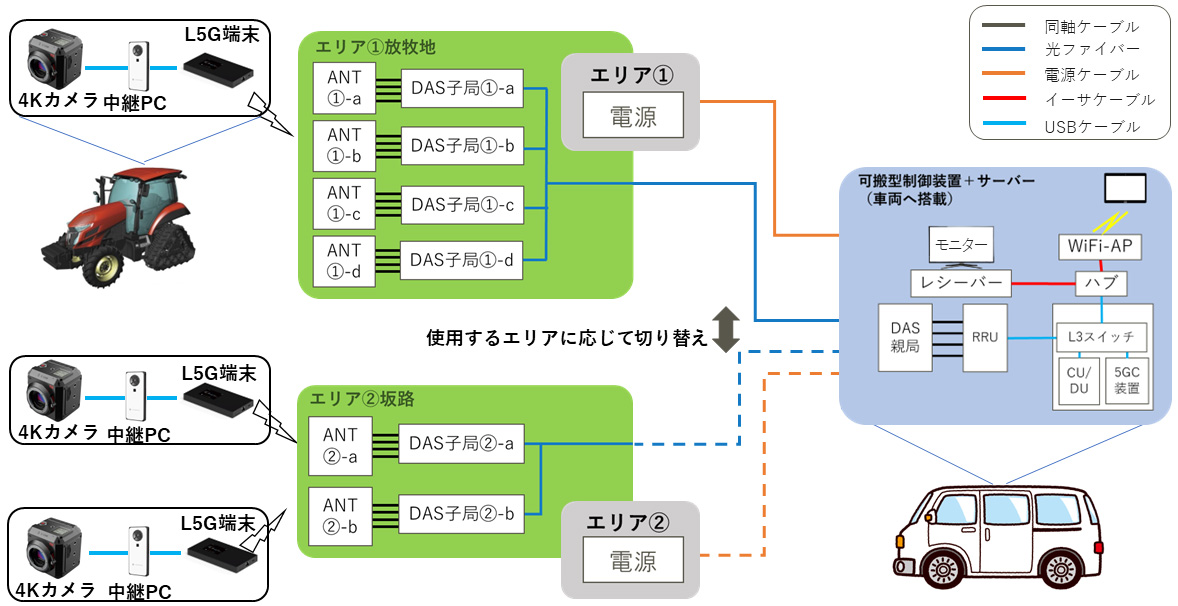 本実証実験が行われた場所は、建造物などがほとんどない広大な放牧地であり、電波の反射が起きにくい環境です。一方、ローカル5Gの電波は直進性が高い高周波数であることから、このような場所に障害物が現れると、電波が遮断されてしまい、映像伝送における映像瞬断の発生が想定されます。その対策として、本実証実験では、一つのアンテナとの通信が遮断されても、別のアンテナが通信を維持する分散アンテナシステム(DAS: Distributed Antenna System)を採用。広大かつ反射物の少ない環境でも安定したローカル5G通信を構築できることを検証しました。