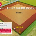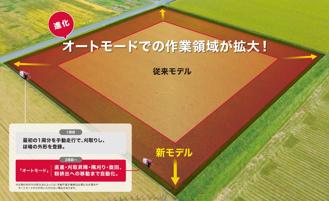 従来モデルでは、オートモードを使用するまでに外周3周を手動で刈取る必要がありましたが、今回のモデルでは、直進・刈取昇降・旋回・籾排出への移動に加えて、新たに「隅刈り」も自動化を実現し、最短2周目からオートモードの使用が可能となりました。これにより、さらなる省力化が期待され、コンバイン操作に不慣れなオペレーターでもより作業が容易に行えます。また、従来モデルのオートコンバインにも後付けで本機能を追加することが可能です。