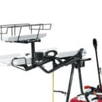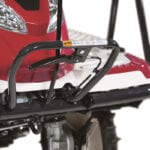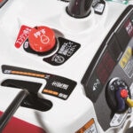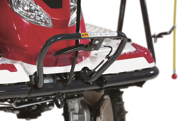 「YR-Cシリーズ」は、機体を降りた状態で微速前進・停止の操作が行えるレバーを搭載し、ほ場の出入りやあぜ越え、トラックへの積み下ろしも安心して操作ができます。「微速前進レバー」を握ると、微速で前進、離すと停止します。「CSレバー」を握ると、機体から降りたまま簡単にブレーキをかけることができます。また、「フロントハンドル」で、ほ場の出入りやあぜ越えでの機体の前上がりを抑えられます。万が一の時には、「エンジン停止スイッチ」を押すだけでエンジンを停止できます。