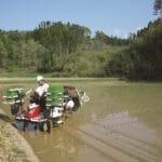 「回転式すこやかレール」を段積みの状態からレール状に伸ばすことで、無理のない姿勢であぜから苗補給を行えます。レールの状態では補助ローラがせり上がるので、軽い力でスムーズに苗を送ることができます。