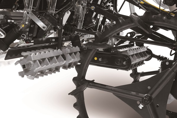 枕地の植付け作業は、3分割された「すこやかロータ―」で旋回跡を均平に整地するので、トンボによる手ならし作業が不要です。「すこやかロータ―」は、ほ場の硬さに応じて植付部のレバーで7段階に高さを調節できます。