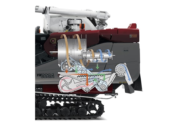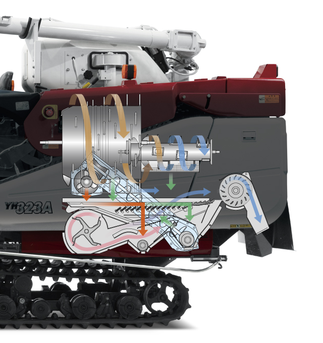 「こぎ胴」+「送塵口処理胴」のロングこぎ胴で大量の籾を能率よく脱こくします。さらに「あざやかロータ」が籾から枝梗をしっかり取り除き、籾が揺動板全体に均平に拡散することで、よりきれいな選別が行えます。