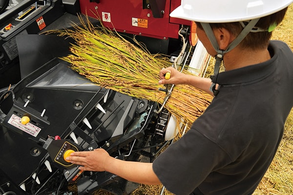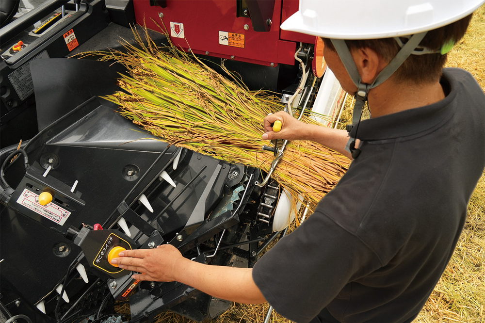本機では、フィードチェーンへの巻き込まれ事故を防ぐ「手こぎ安全装置」を搭載し、安全性が向上しました。また、小型機ながら籾の排出作業を効率化するオーガシュータを搭載することで作業性が大幅に向上しました※2。