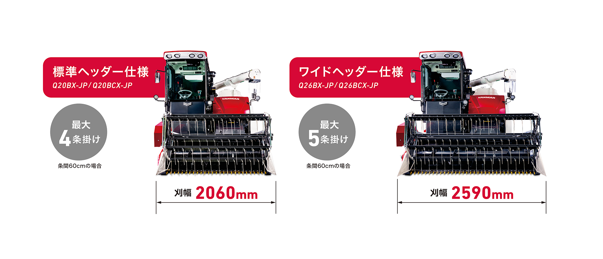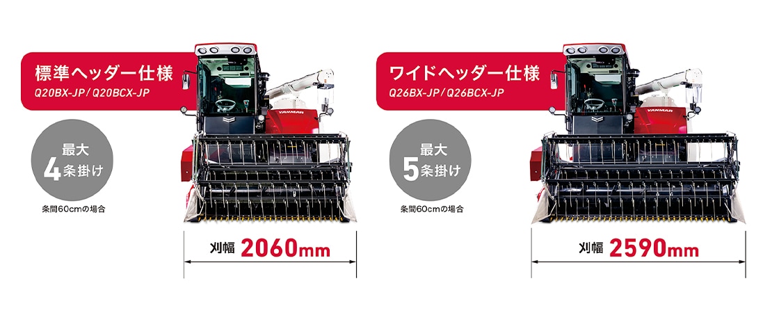 コンパクトな機体に69馬力のエンジンを搭載し、基本性能を充実させることで精度とスピードを両立した収穫作業が行えます。また、作業環境や圃場規模などに合わせ、2.0mと2.6mの2種類のヘッダーから選択が可能です。また、1600Lの大容量グレンタンクにより、連続して刈取りできる面積が広く、作業能率が向上します。