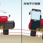 ほ場の起伏などを感知し、左右のクローラを上下させて水平を保つ「機体水平制御」に加え、大豆など高さの異なるうねや傾斜地でも刈取部をうねに対して平行に保つ「対地平行制御」を新たに採用しました。さらに、作物の刈高さを一定に制御できる「自動刈高さ制御」も装備することで、土の混入による汚粒の発生を抑え、きれいな収穫を実現します。