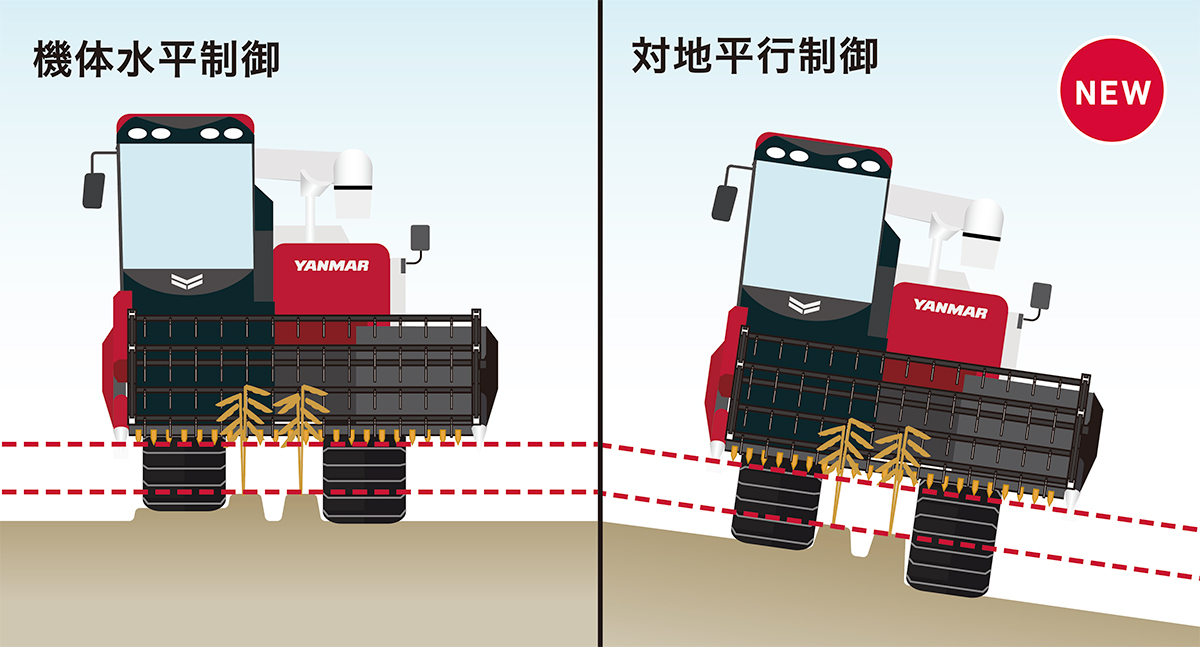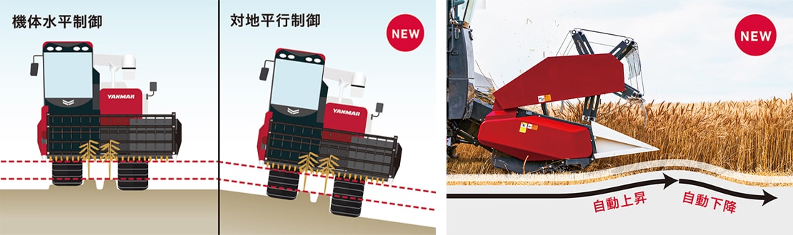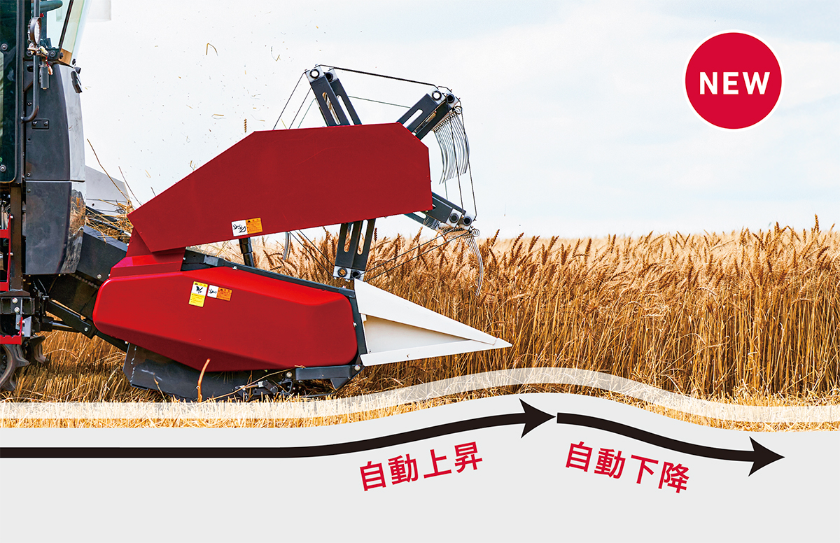 本機では、シンプル装備でありながら、他の型式で好評の対地平行制御や自動刈高さ制御、刈取オートリフトスイッチ・オートセットスイッチなどを新たに搭載することで、作業の安定性、効率性が大幅に向上しました。
