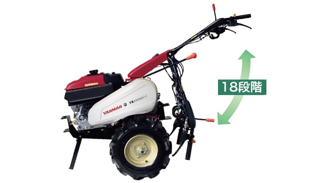 ハンドル逆位置でも同じ変速段数で、うね立て作業時などハンドル逆位置での前進移動がスピーディに行えます。また、主変速レバーは手元レバーでカンタンに操作ができます。