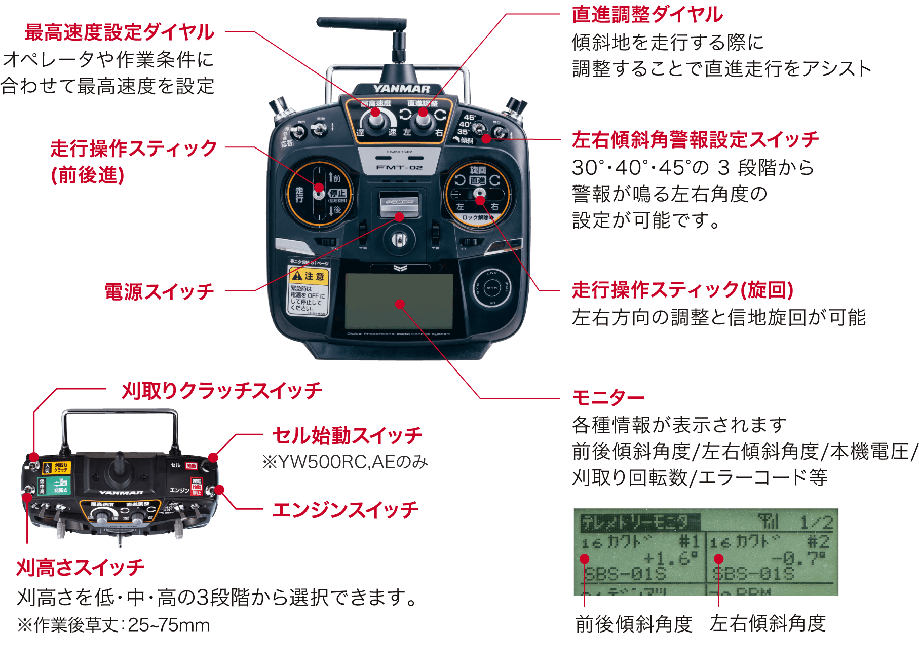 簡単にエンジン始動が可能。斜面や幅、高さに制限のある場所でも、安全な場所から遠隔でエンジン始動できるので、スムーズに作業を開始できます。
