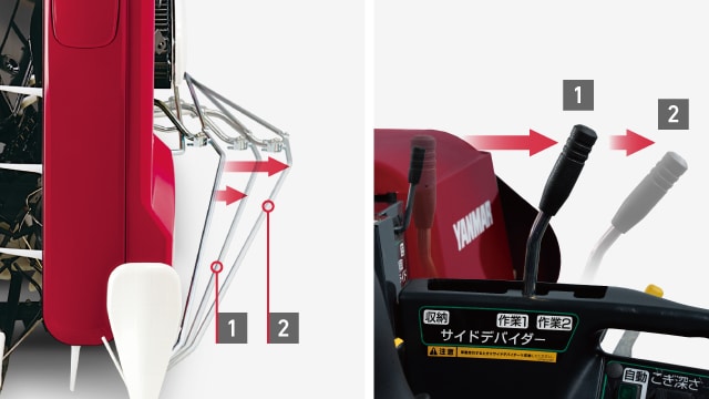 刈取部が左右にスライドでき、あぜ際刈りや中割りも簡単に。未刈株への泥寄せも抑えます。