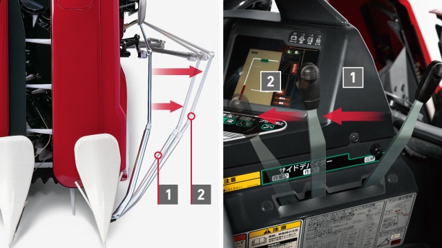 刈取部が左右にスライドでき、あぜ際刈りや中割りも簡単に。未刈株への泥寄せも抑えます。(スライド幅230mm)