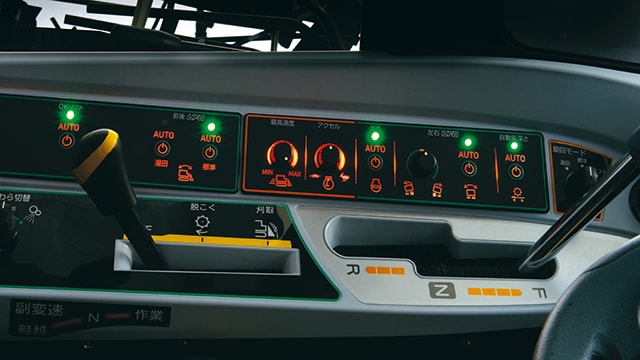 よく使うスイッチを主変速レバーに配置、手を離さずにさまざまな操作ができます。