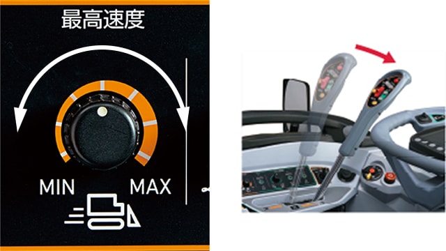 作業に合わせて最高車速を制限可能。低く設定すれば変速レバーをフルに倒しても速度が出すぎず、操作に不慣れでも安心して作業ができます。