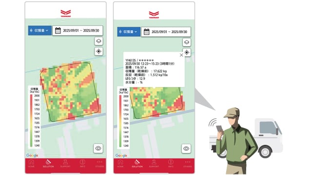 揚穀投げ口に取り付けた収穫量センサーがリアルタイムの収穫量を測定します。収穫量データと収穫時の位置データを組み合わせ、農林水産省が提供する農地の区画情報「筆ポリゴン」が示すほ場内の収穫量を合計し、ほ場1枚あたりの収穫量としてスマートフォンアプリ「MY YANMAR」に表示します。