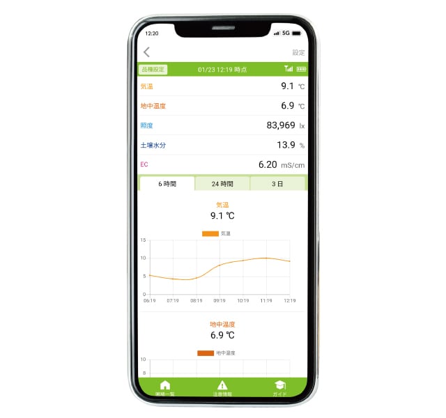 アプリでは6時間単位、24時間単位、3日単位でデータを確認できます。それぞれの時間帯の圃場環境の変化がひと目で分かります