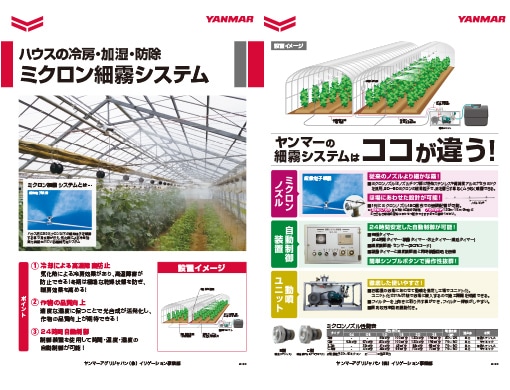 ミクロン細霧システムとはハウス内に50ミクロン以下の超微粒⼦を噴霧する事で潅⽔等が⾏え、気化熱による冷却効果も実証されている機能的なシステムです。