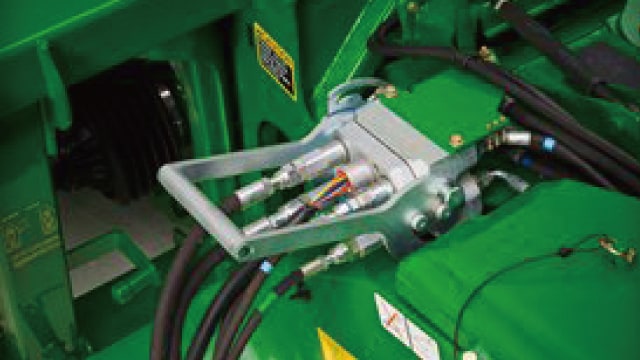 コンバインに刈取りプラットフォームを装着した後、工具を使わずに油圧・電装関連の接続が可能です。これらの接続はワンタッチマルチカプラーに集約され、簡単に刈取りプラットフォームの着脱を行うことができます。