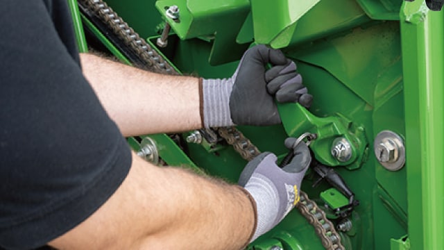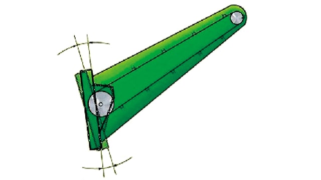 前後傾斜角度は、フィーダーハウスに取り付けられているターンバックルで調整できます。刈取りプラットフォームの最適な作業姿勢の確保に役立ちます。