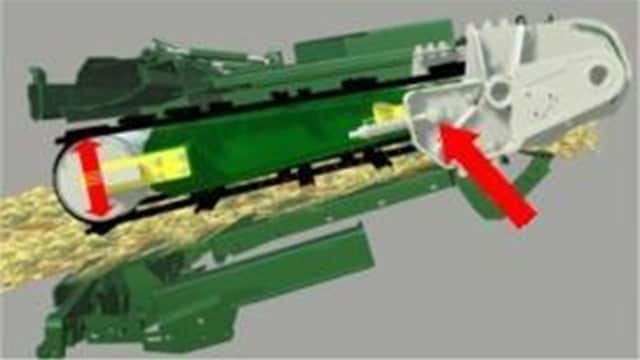フロントフィードドラムはフィーダーハウスの中央フレームに取り付けられており、フィーダーハウスの後方をピボットポイントとし、ドラムと内部フレームは自由に上下に動きます。作物にかかる圧力を一定にし、作物量が多い場合も詰まりなく、スムーズな流れを実現します。
