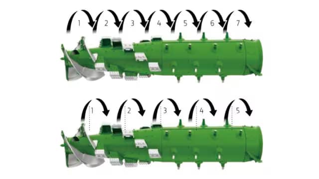 羽根角度を標準位置に設定すると、作物はローター周りを7回転し、より高い分離性能を発揮します。ストロー品質の維持やチャフシーブの負荷を軽減したい場合、羽根角度を前進位置にすることで、ストローは5回の回転でコンバインの外に排出されます。